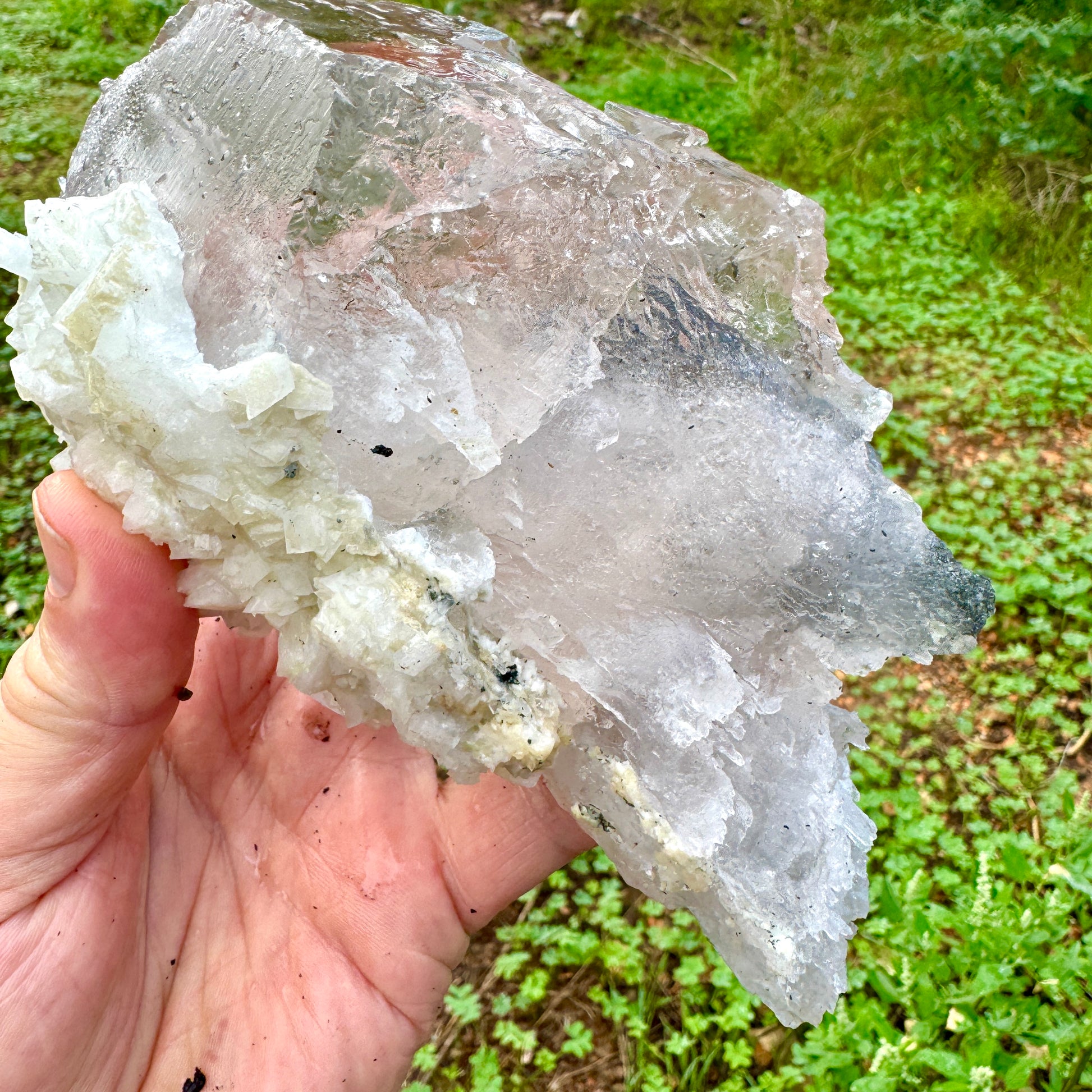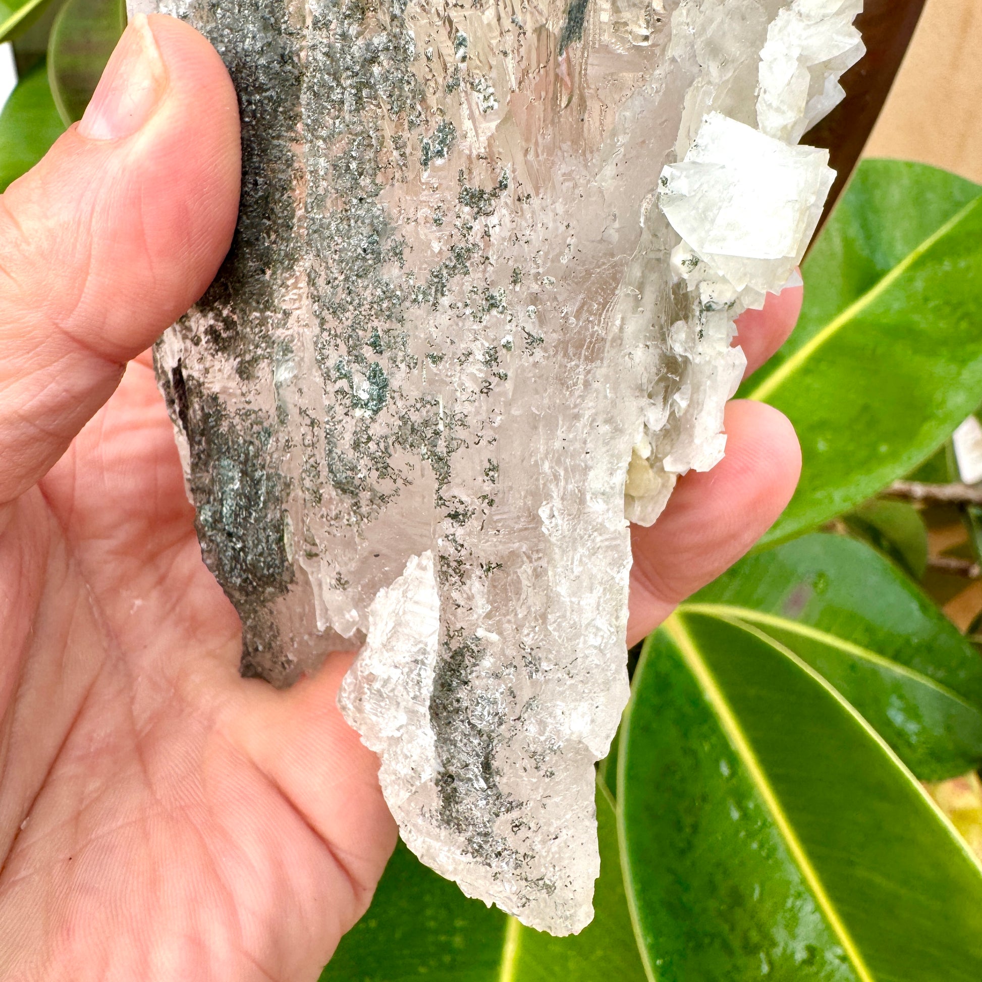 Adosados en su cuerpo, cristales de baritina blanca aportan brillo y pureza, como si fueran guardianes de su poder, mientras una delicada capa de clorita en su reverso le otorga un toque de sanación y arraigo a la Tierra.