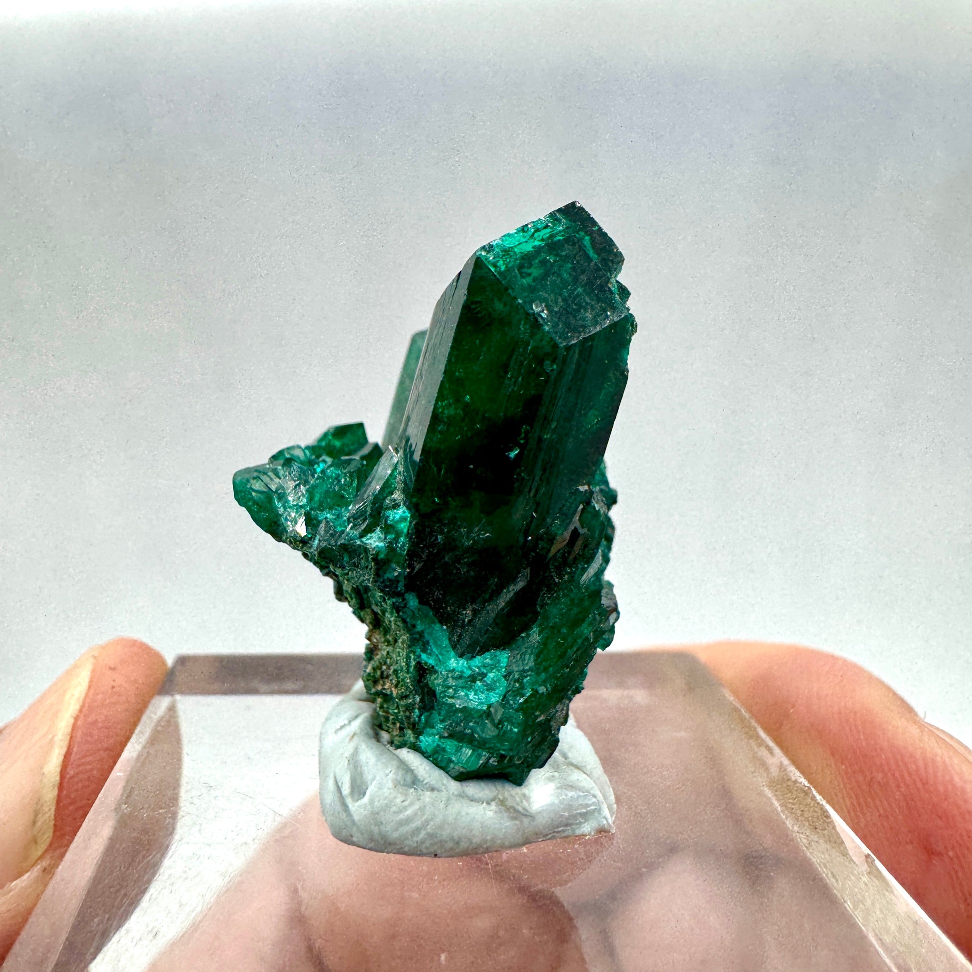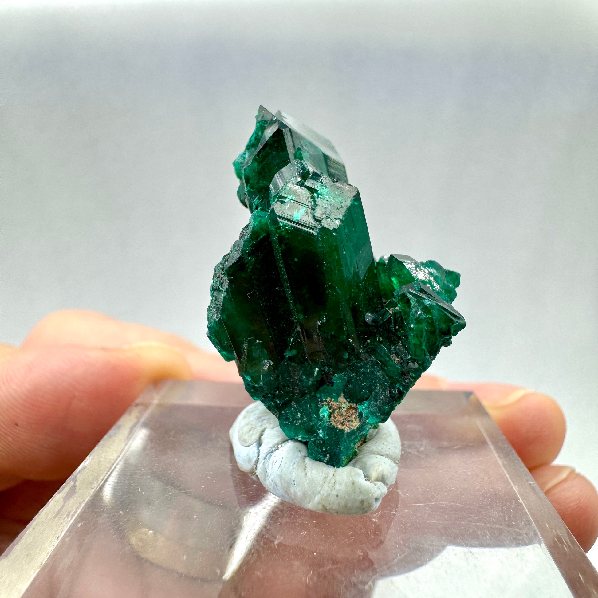 Su energía vibrante y su pureza visual la convierten en un cristal irresistible tanto para coleccionistas exigentes como para quienes buscan una pieza decorativa de gran impacto. Esta Dioptasa es una verdadera joya natural que atrae todas las miradas y realza cualquier vitrina o espacio mineralógico con su magnetismo y elegancia.