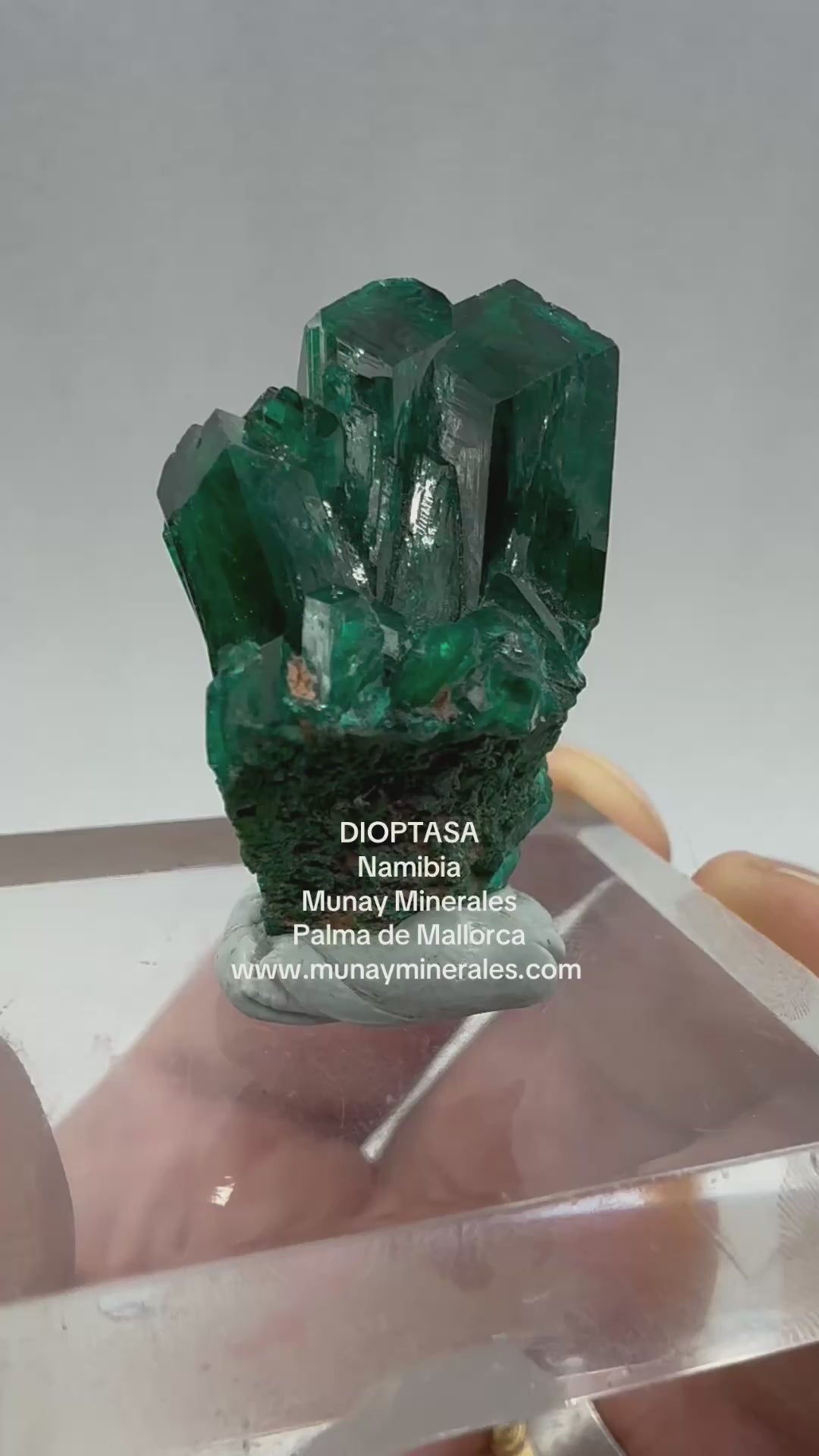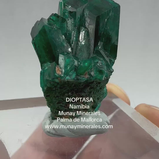 La Dioptasa de Tsumeb es una gema mineralógica de extraordinaria belleza, admirada por su intenso color verde esmeralda, su brillo vítreo y sus cristales perfectamente definidos. Procedente de las míticas minas de Tsumeb, en Namibia —una de las localidades más prestigiosas del mundo—, cada ejemplar es una pieza única de colección.
