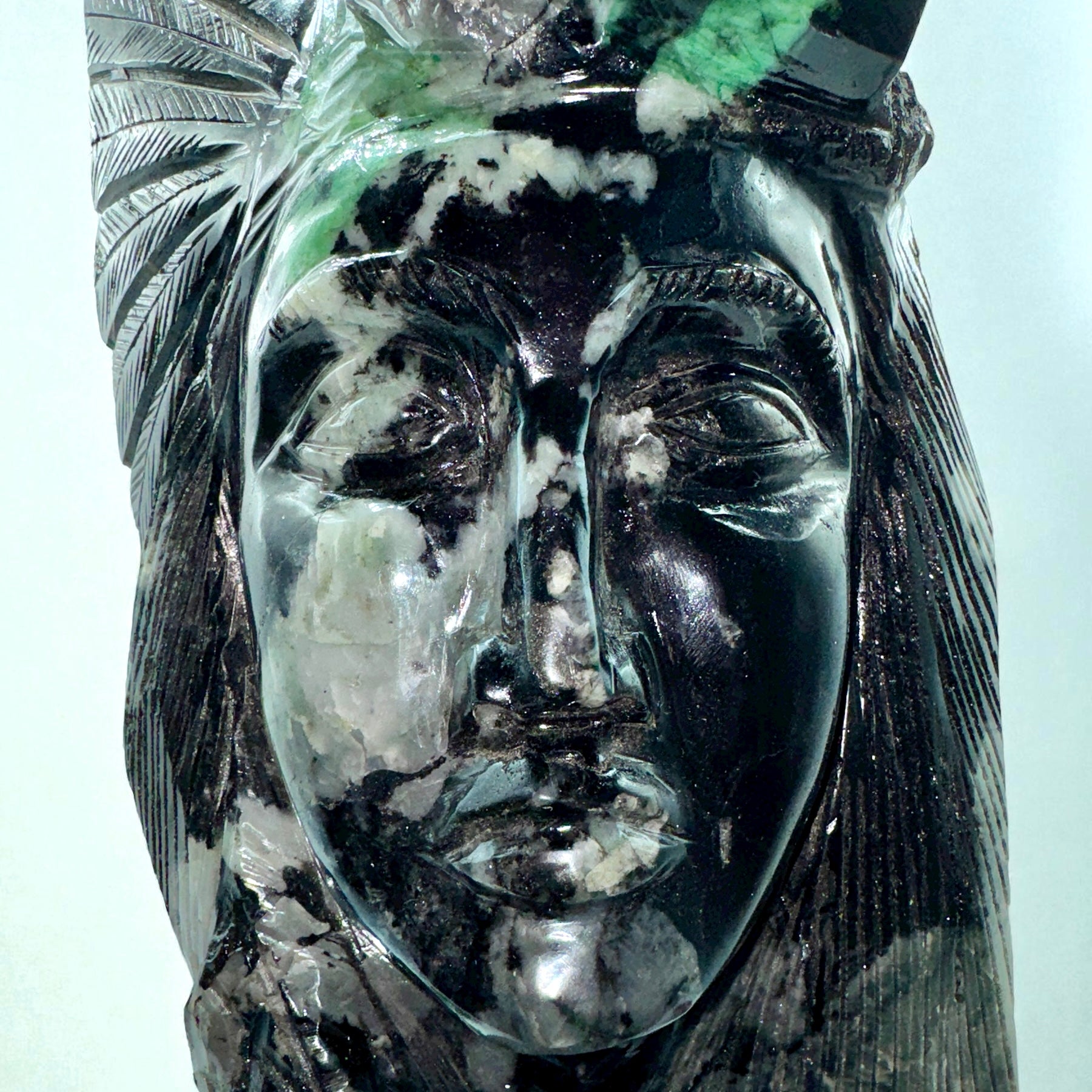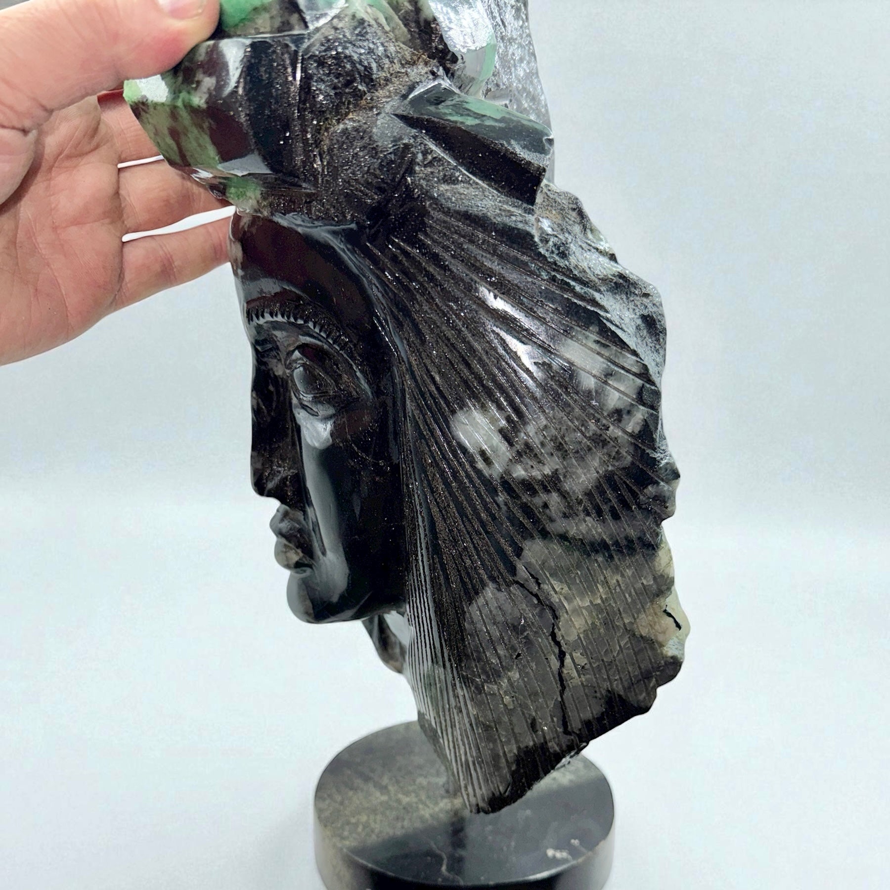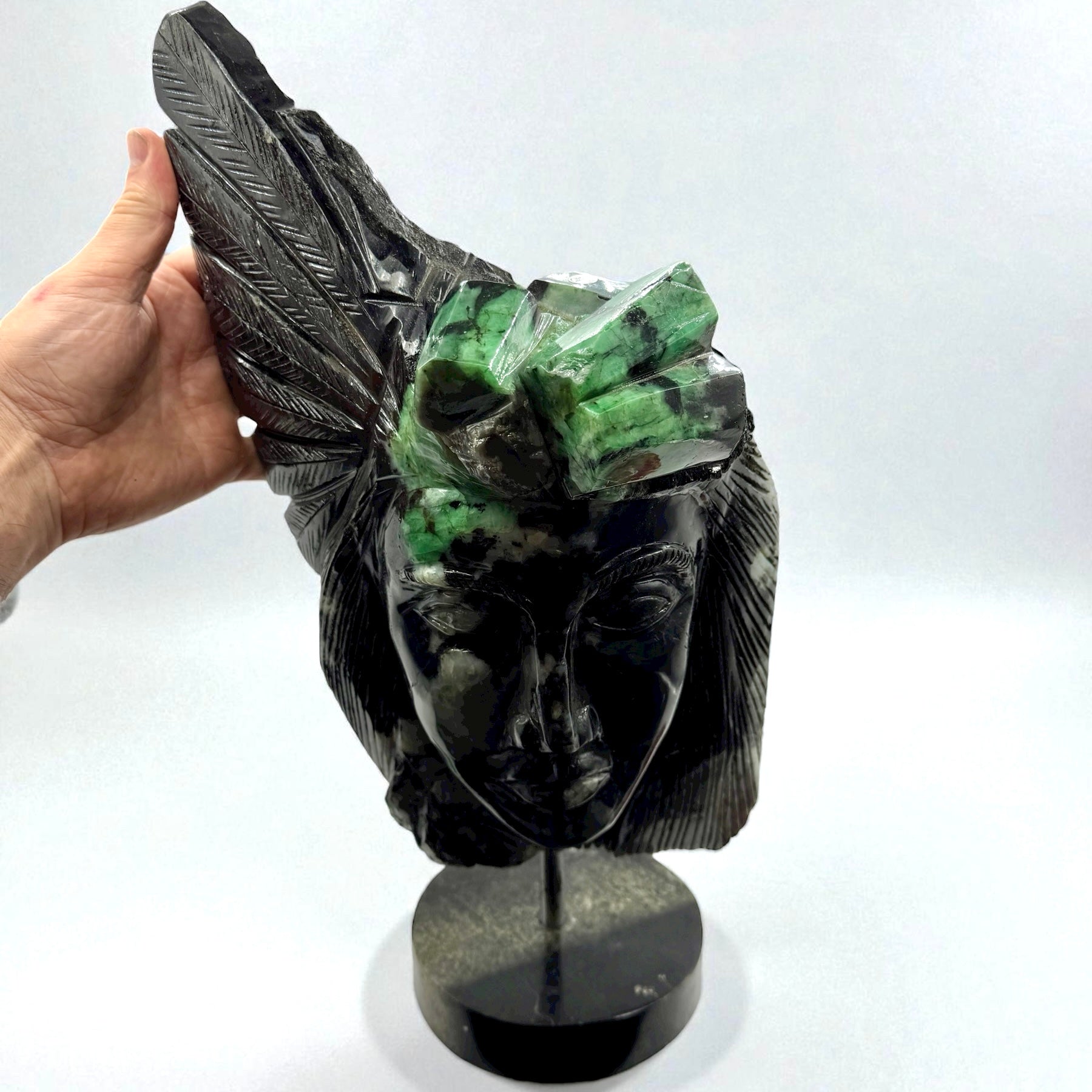 Preciosa escultura tallada a mano en forma de indígena con incrustaciones de grandes esmeraldas de tono opaco pulidas.