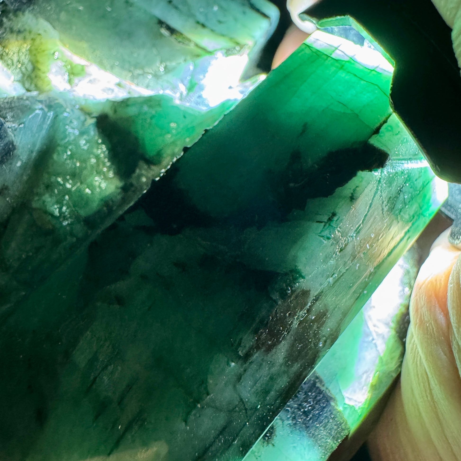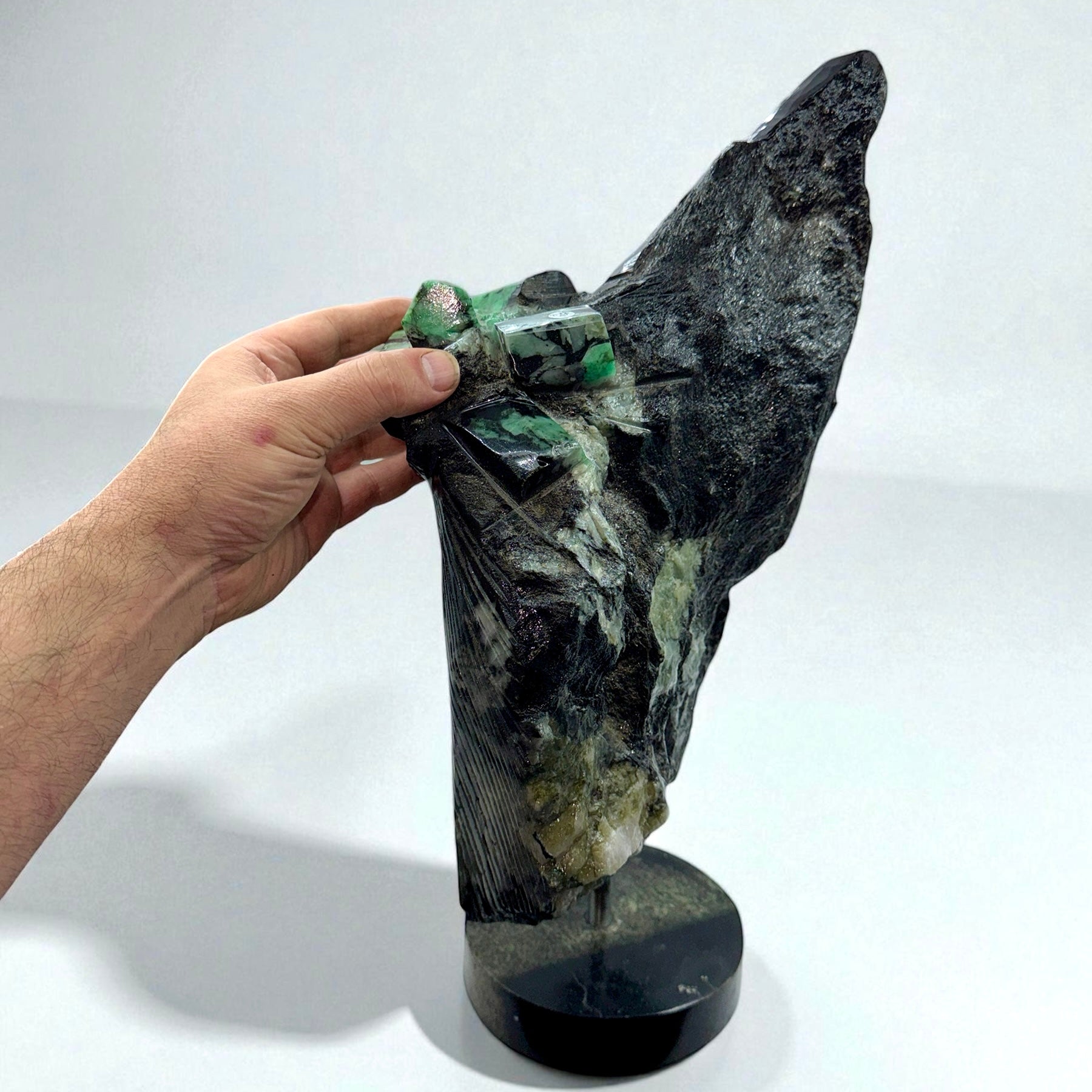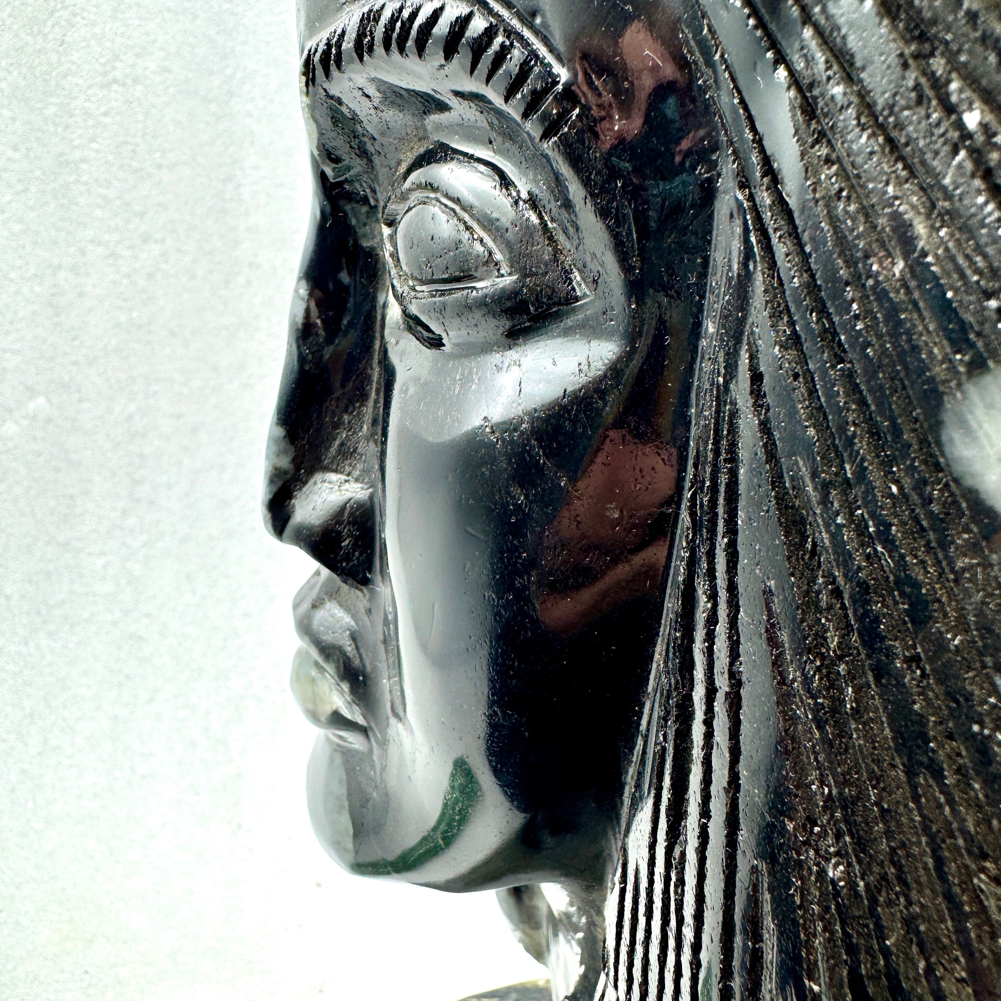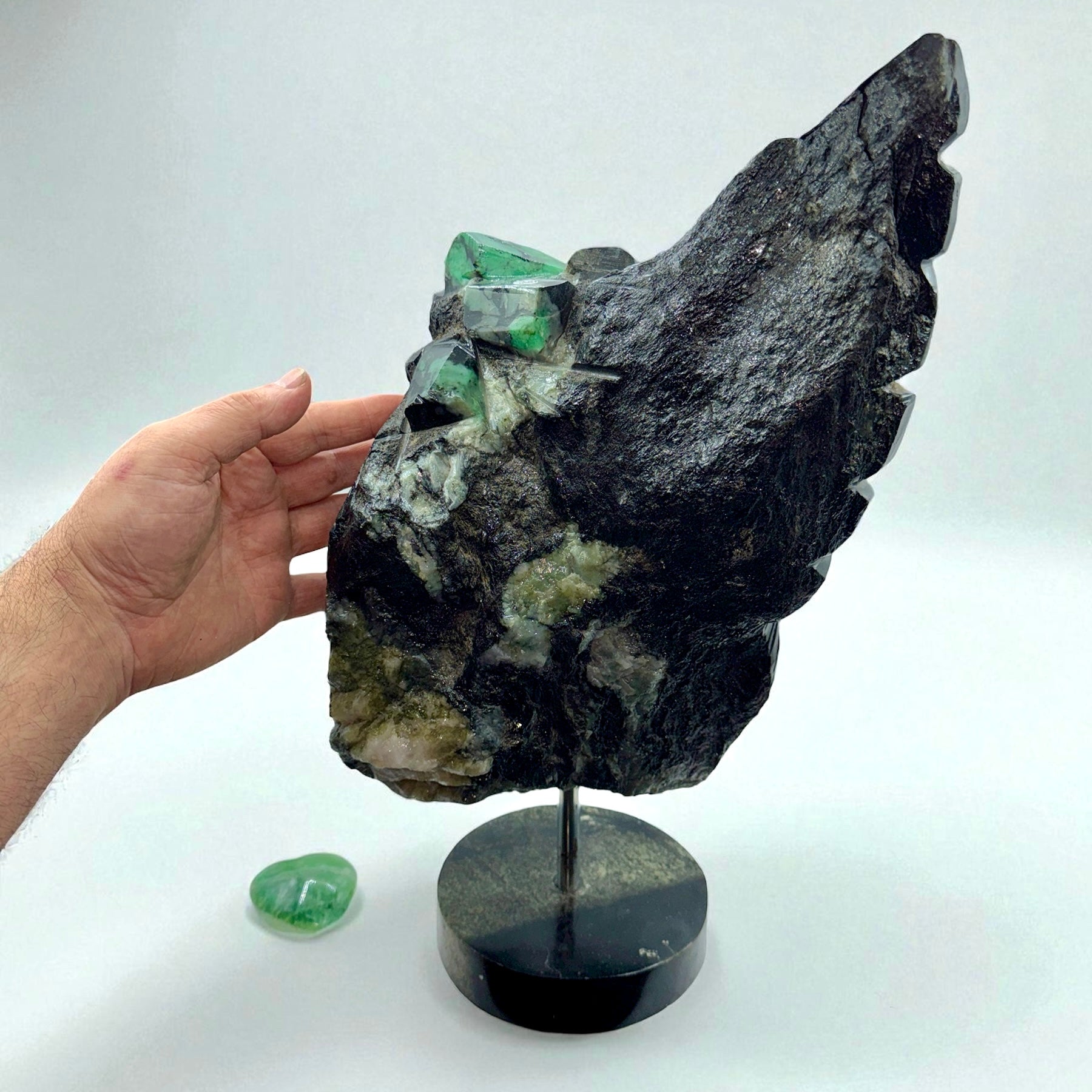Preciosa escultura tallada a mano en forma de indígena con incrustaciones de grandes esmeraldas de tono opaco pulidas.