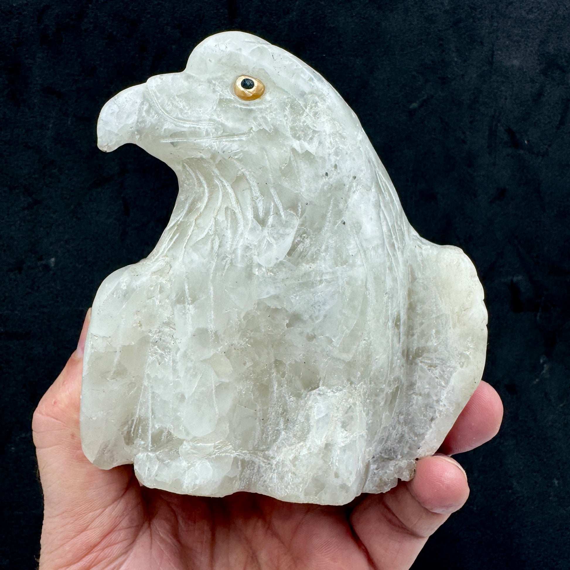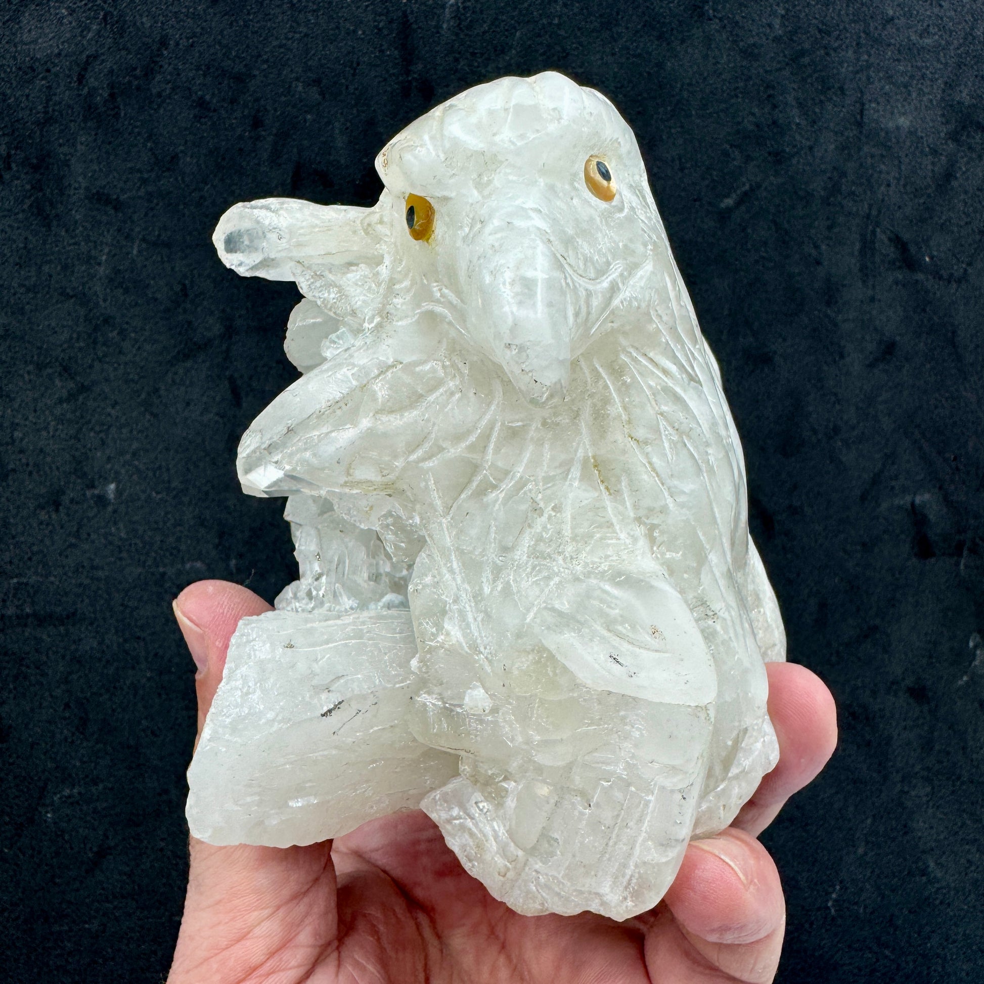 Espectacular águila tallada a mano en grupo de cuarzos con inclusiones de fluorita azul.