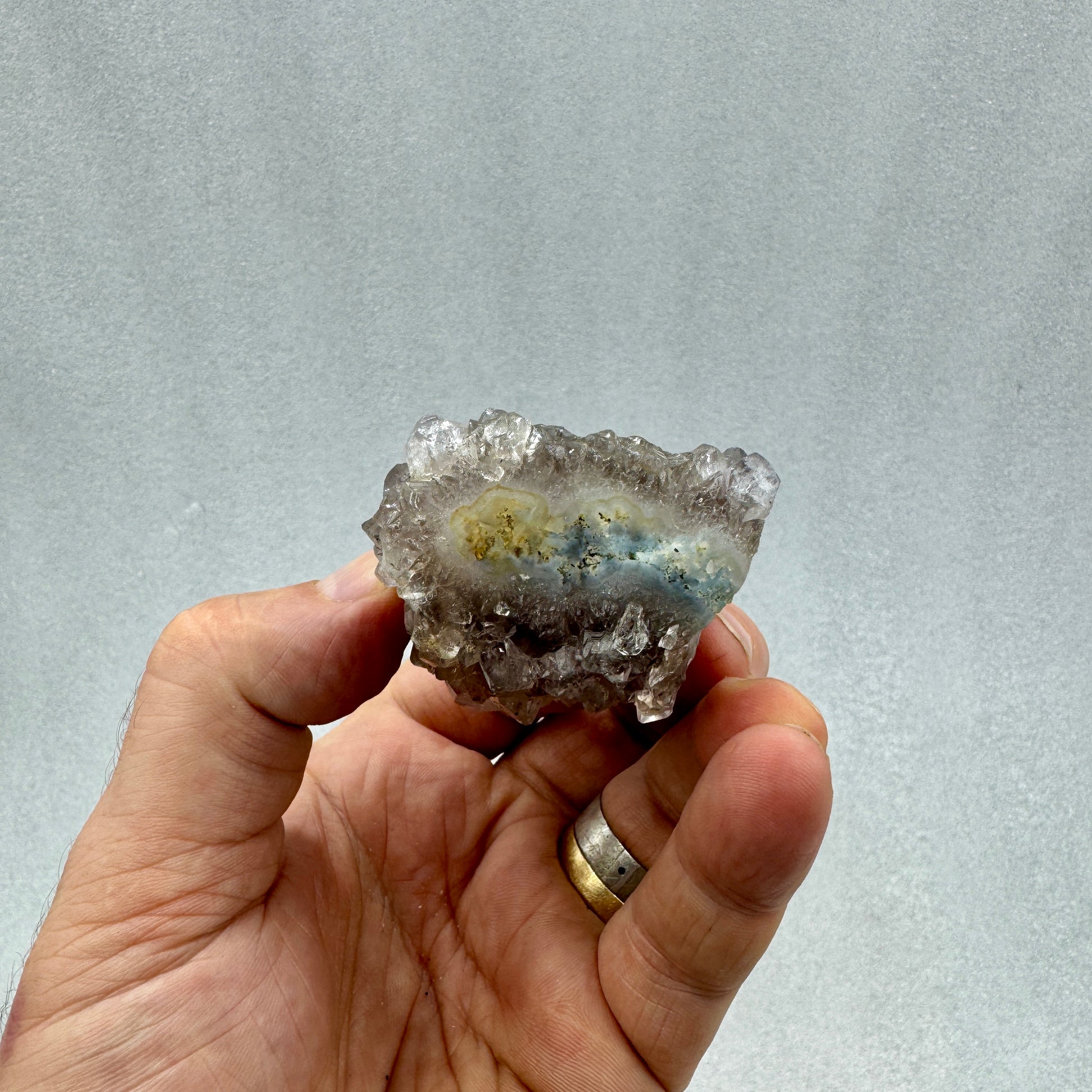 • En un corte transversal, se pueden ver anillos de crecimiento, que van del blanco o gris (cuarzo o calcedonia) hasta el violeta intenso de la amatista.